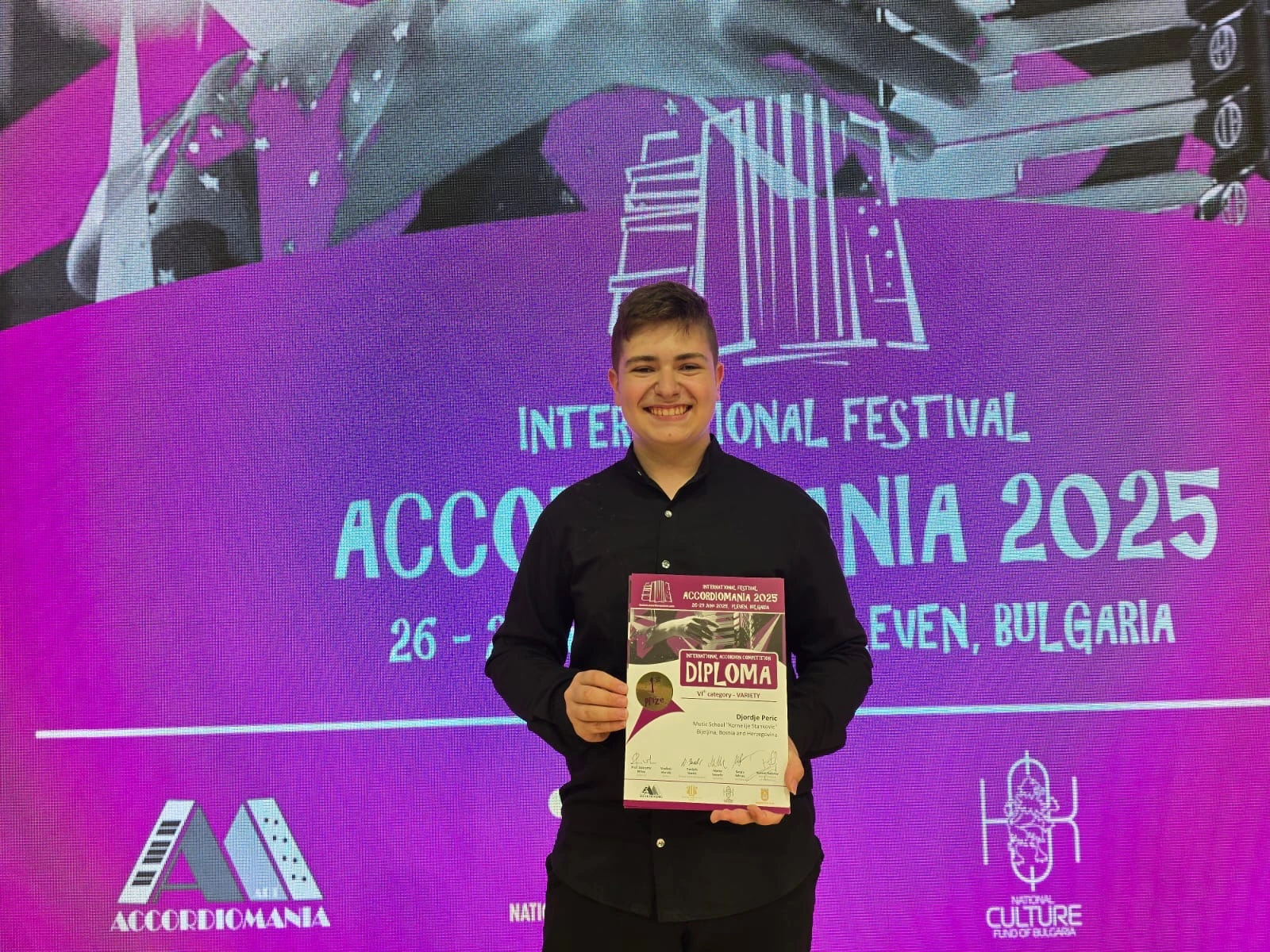 Petnaestogodišnji mladi virtuoz iz Bijeljine, Đorđe Perić, ostvario je još jedan izuzetan uspjeh na međunarodnoj sceni — proglašen je 𝗹𝗮𝘂𝗿𝗲𝗮𝘁𝗼𝗺 (pobjednikom) u prestižnoj kategoriji 𝙫𝙞𝙧𝙩𝙪𝙤𝙯𝙤 𝙙𝙤 18 𝙜𝙤𝙙𝙞𝙣𝙖 na takmičenju „𝗔𝗰𝗰𝗼𝗿𝗱𝗶𝗼𝗺𝗮𝗻𝗶𝗮 𝗔𝗿𝘁“, koje se održava od 26. do 29. juna 2025. godine u bugarskom gradu Pleven.